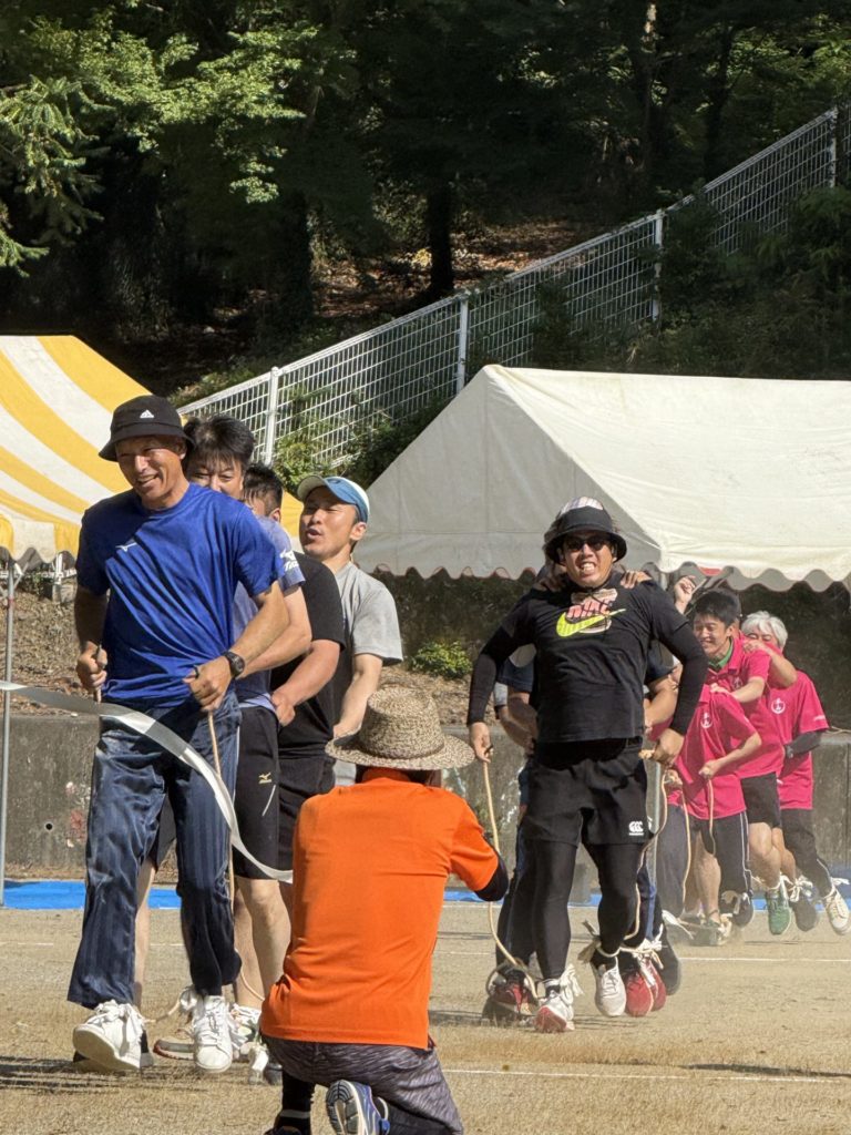 さて、当日は、熱中症対策の一環として3競技ごとにクーリングタイムが設けられ、冷たいドリンクの提供やミストシャワーが数か所に設置されました。そのような環境の中で準備・整理体操を挟み10のプログラムが怪我や熱中症も出ずに無事行われました。どの競技も大変盛り上がり、百足競争、竹取物語、ラブ2レース、クラブ対抗リレーなどは周りの声援も大きく、各チームとも優勝を目指した真剣勝負がみられました。特にクラブ対応リレーは4人1組で行われ、各自グラウンドを1周(約130m)走るということで園児や高齢者チームにとってはややきつい競技でしたが、皆さんリタイアもなく完走し、周りからも特に大きな声援が送られました。